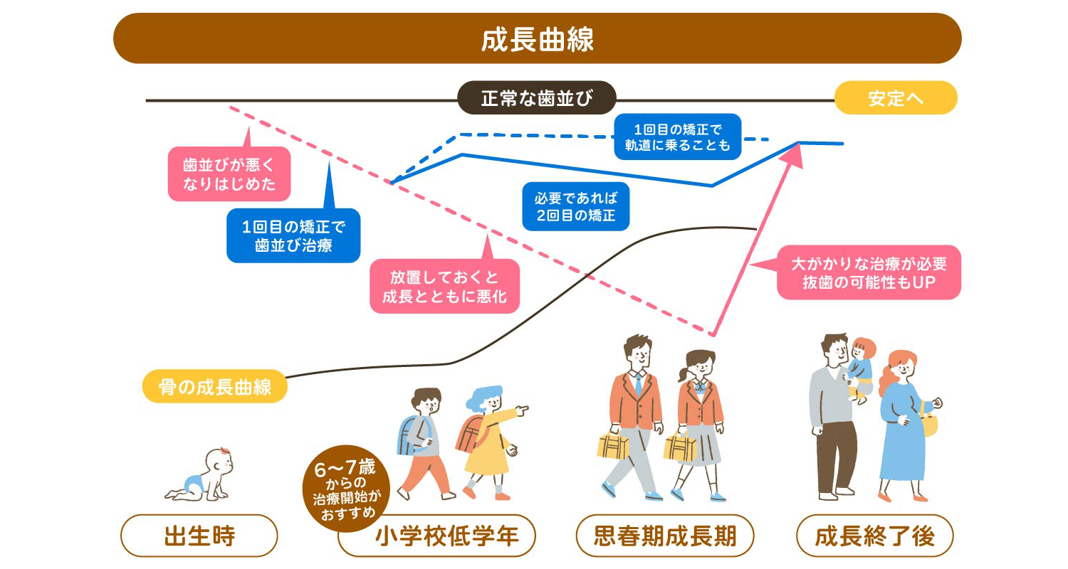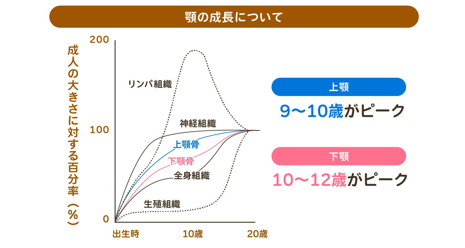 子どもの時期は骨が柔らかく、大人に比べて歯が動きやすい特徴があります。顎の成長を活かすことで、抜歯をせずに歯並びを整えられる可能性が高まります。